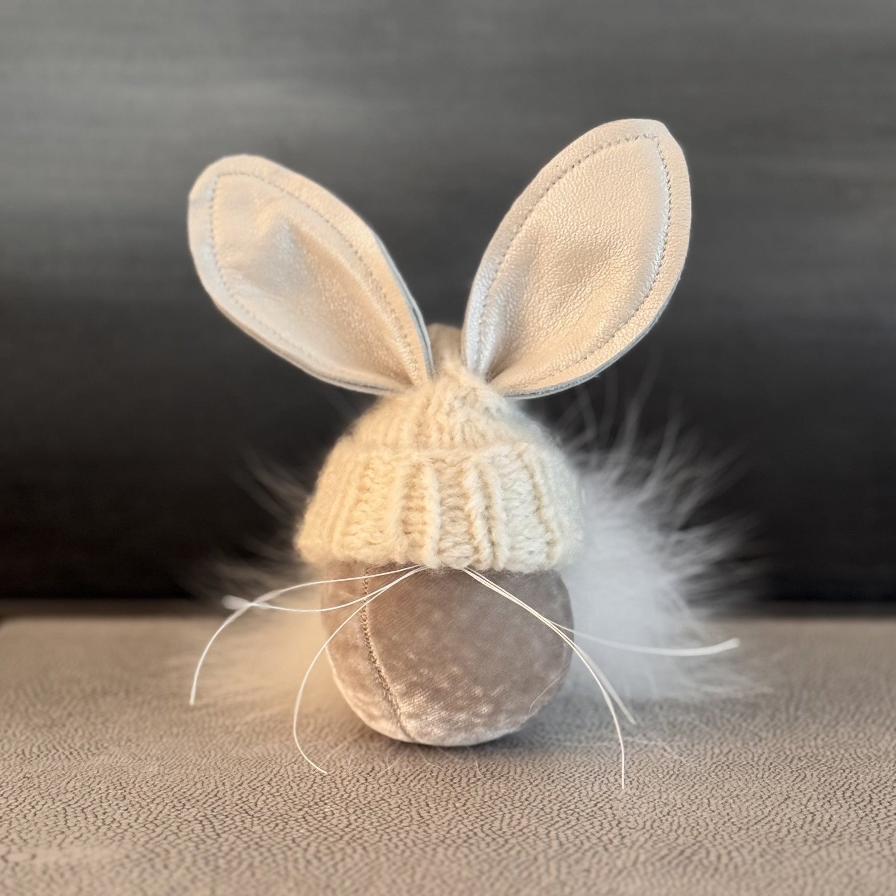 I am tiny and soft with a snow velvet coat, pearl ears a big white fluffy tail and my hand knit cashmere hat.