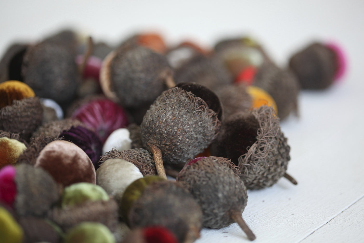 Our tiny velvet acorns are offered in a set of 12, set of 24, a tiny nest with 3 acorns, and a tiny nest with 6 acorns. They are offered in bright, fall, and neutral color hues. If you have a special color request, please make a note at checkout.