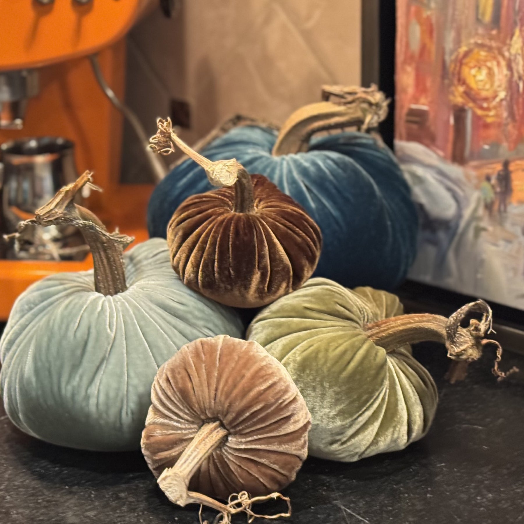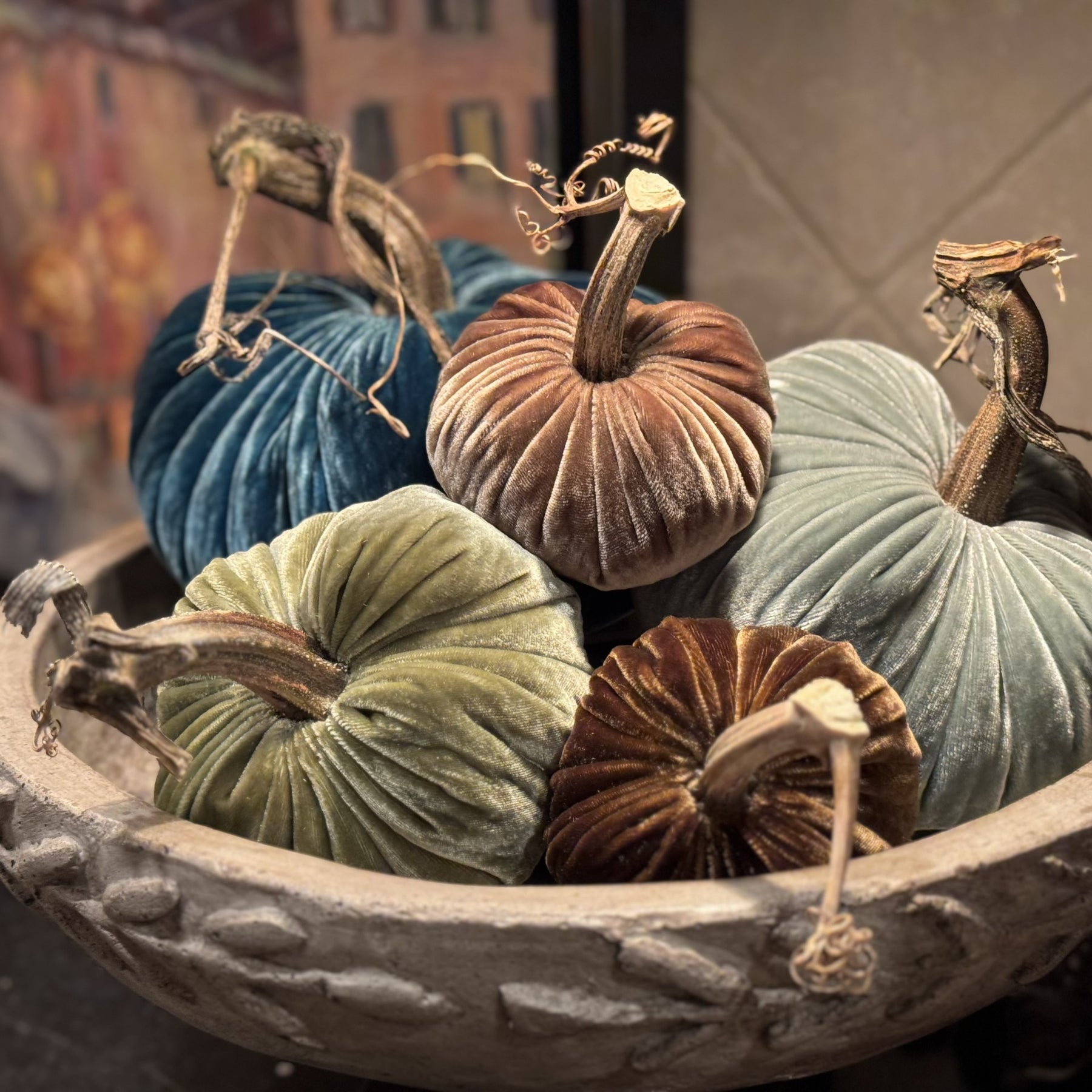 This Collection includes one Peacock 8", one Lagoon 6", one 5" Mist, one 4" Acorn and one 4" stone Velvet Pumpkin