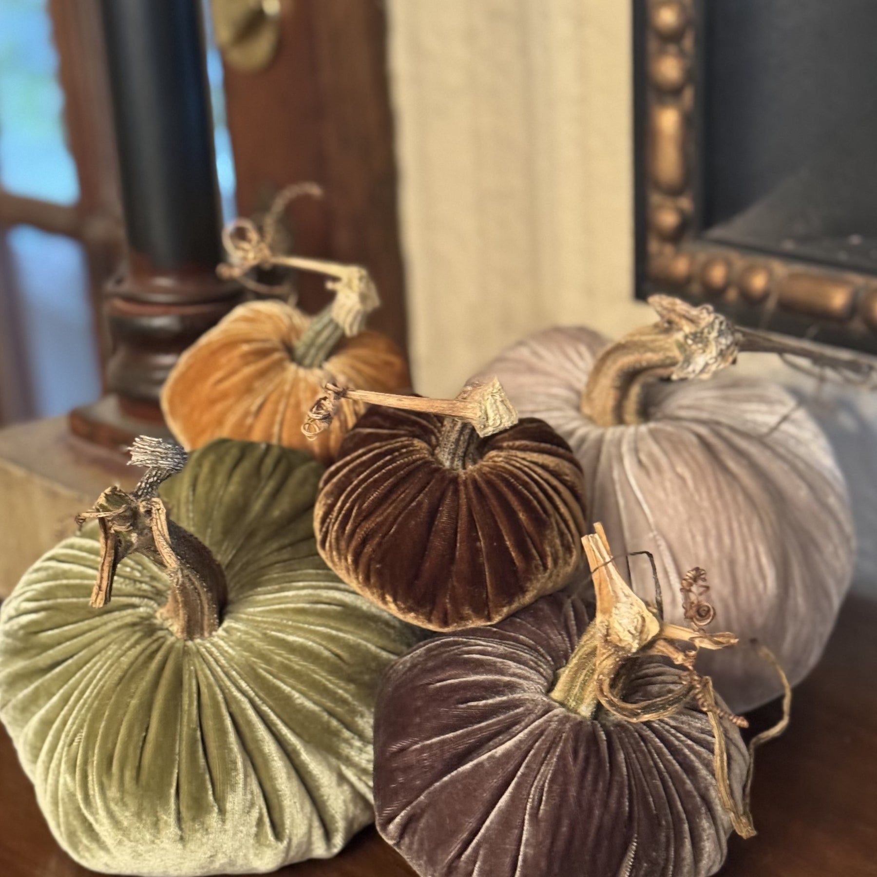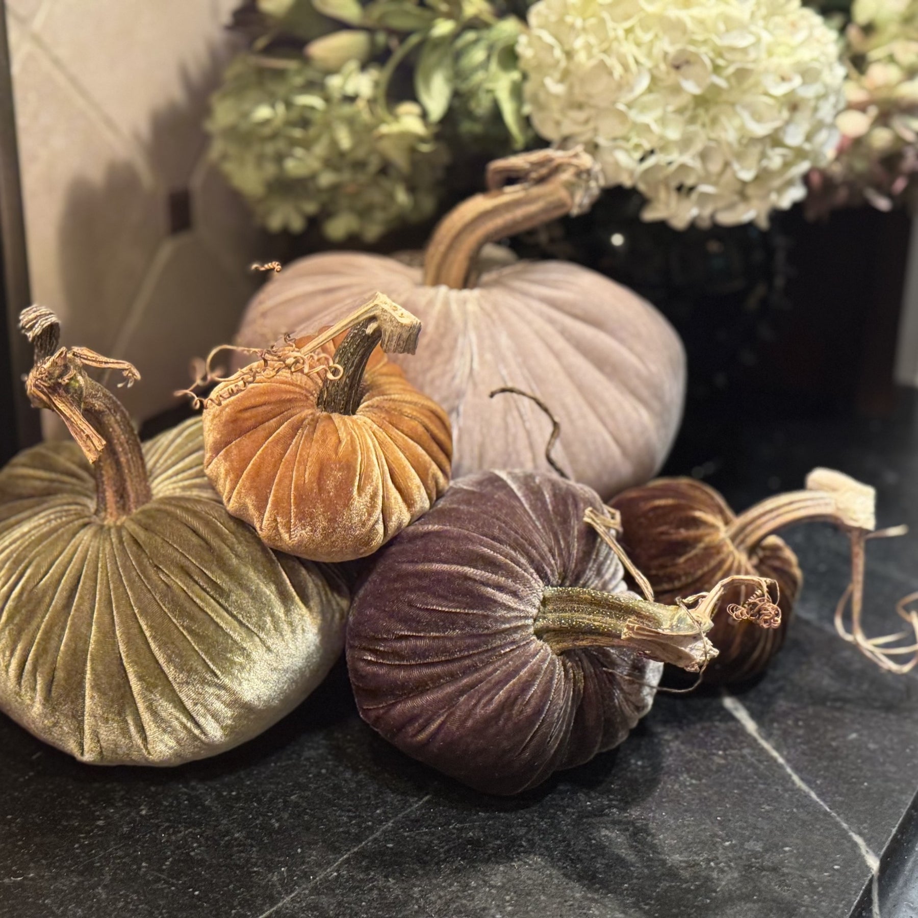This collection includes one 8" Putty, one 6" Mist, one 5" Coal, one 4" Honey and one 4" Acorn Velvet Pumpkin.