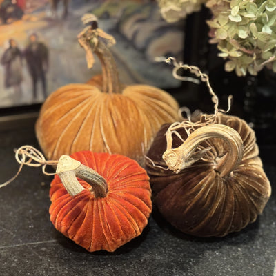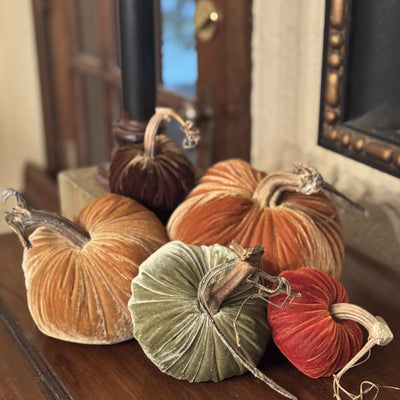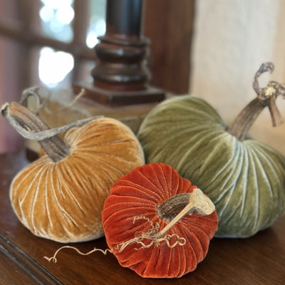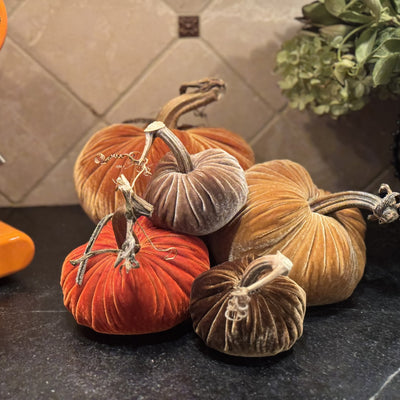 Shopping for traditional Thanksgiving decor? Our handmade velvet pumpkins and decorative pumpkins are made with real stems from pumpkins, gourds and squashes that have been harvested from local farms. These velvet pumpkins and pumpkin decorations in classic fall colors make beautiful Thanksgiving centerpieces. Because our decorative pumpkins and velvet pumpkins come in a variety of sizes and fall colors you can create your own unique Thanksgiving centerpiece. Our velvet pumpkins will add elegance to your fall decor, autumn decor and Thanksgiving table decorations. If you are looking for classic Thanksgiving decor, browse our trademark classic velvet pumpkin sets in traditional fall colors.